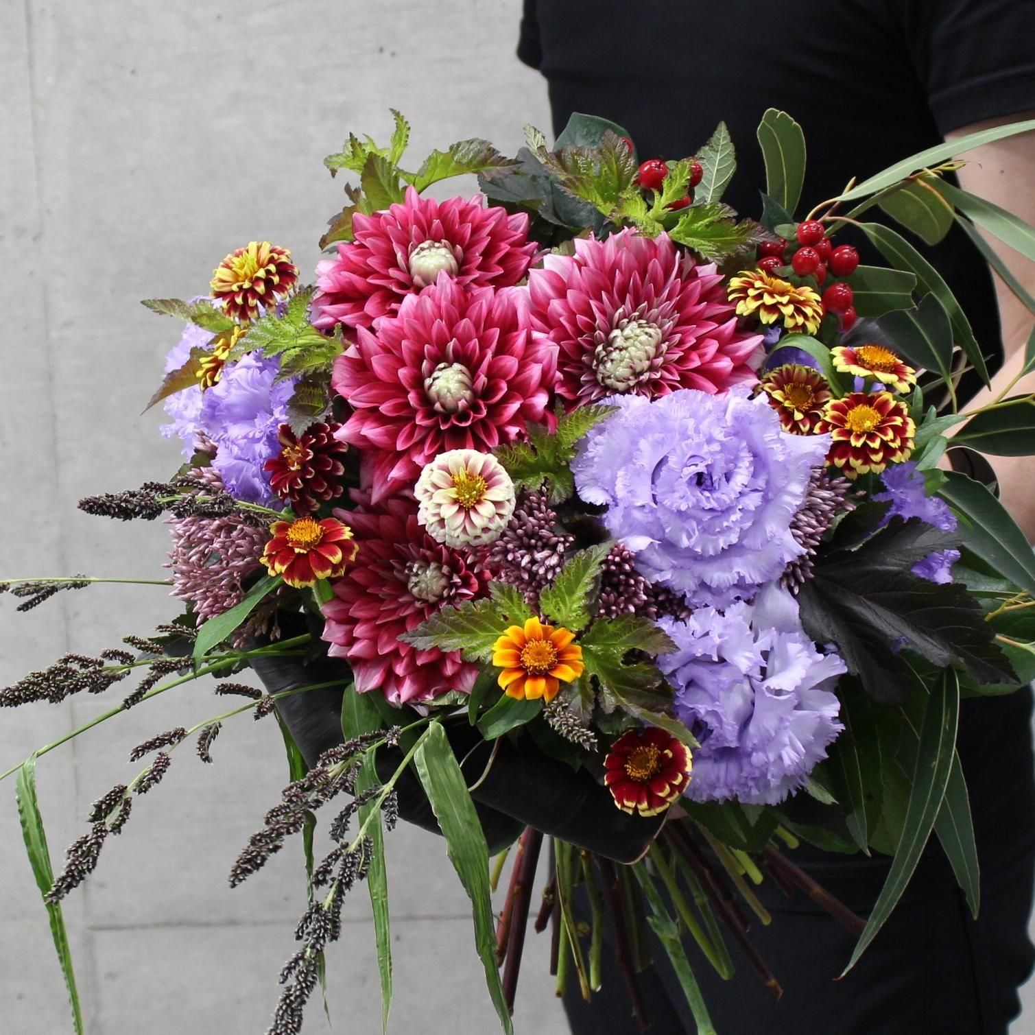 11月クラスは「色とりどりの秋色ダリアを楽しむブーケ」。色鮮やかなダリアをのびのびと束ねるデザインを学びます。