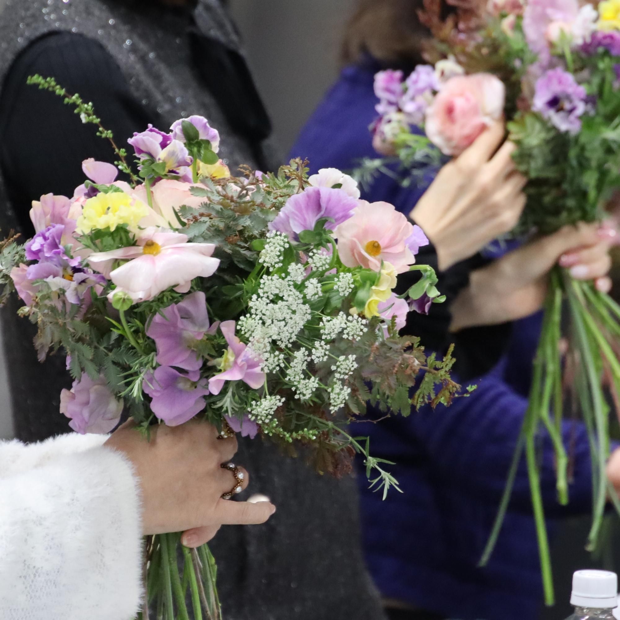 初めてブーケ(花束)を作る方にもおすすめのクラス。スパイラルテクニックの基礎を学びながら、ラウンドブーケのデザインをメインに、毎月異なる季節の花々を束ねます。